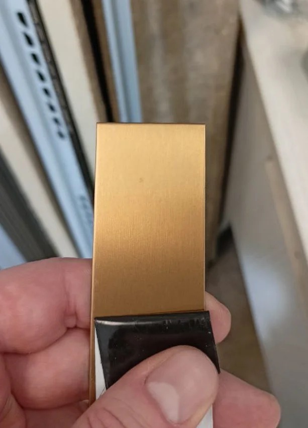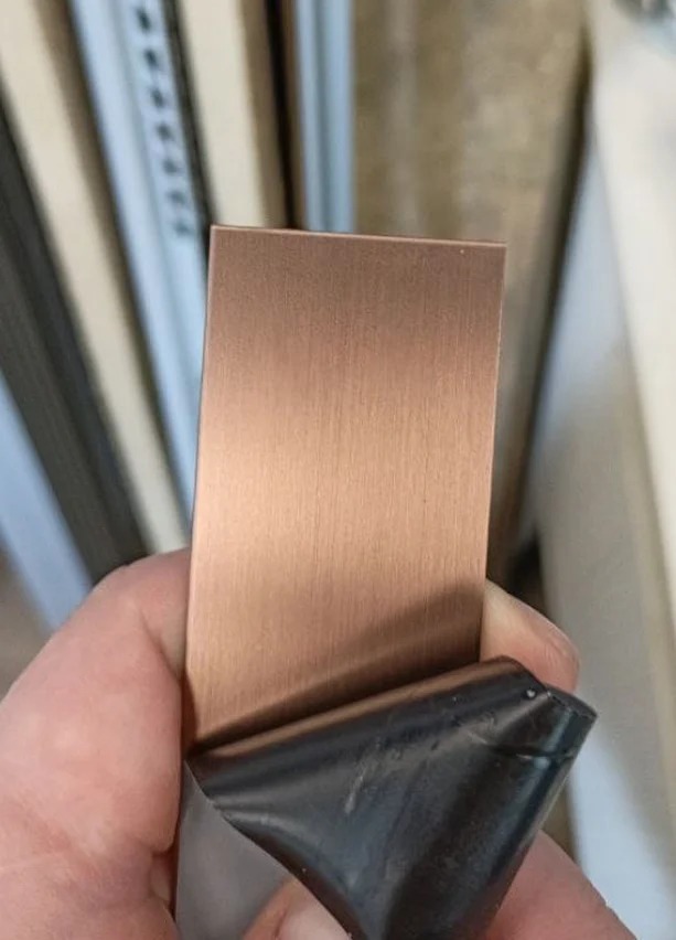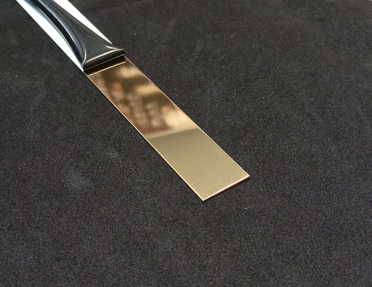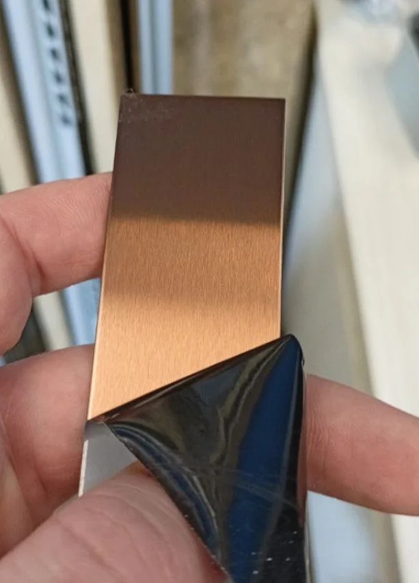 Возможно изготовление из цветного металла (нитрида титана). Базовые цвета, которые чаще всего есть в наличии: золото, под латунь, бронза, медь, серебро. Каждый из этих цветов доступен в двух видах обработки — полированном и шлифованном. Для цветов серебро и золото доступен вариант «суперзеркало» — это полностью зеркальная обработка поверхности с глубоким цветным оттенком, создающая эффект идеально гладкого металла.